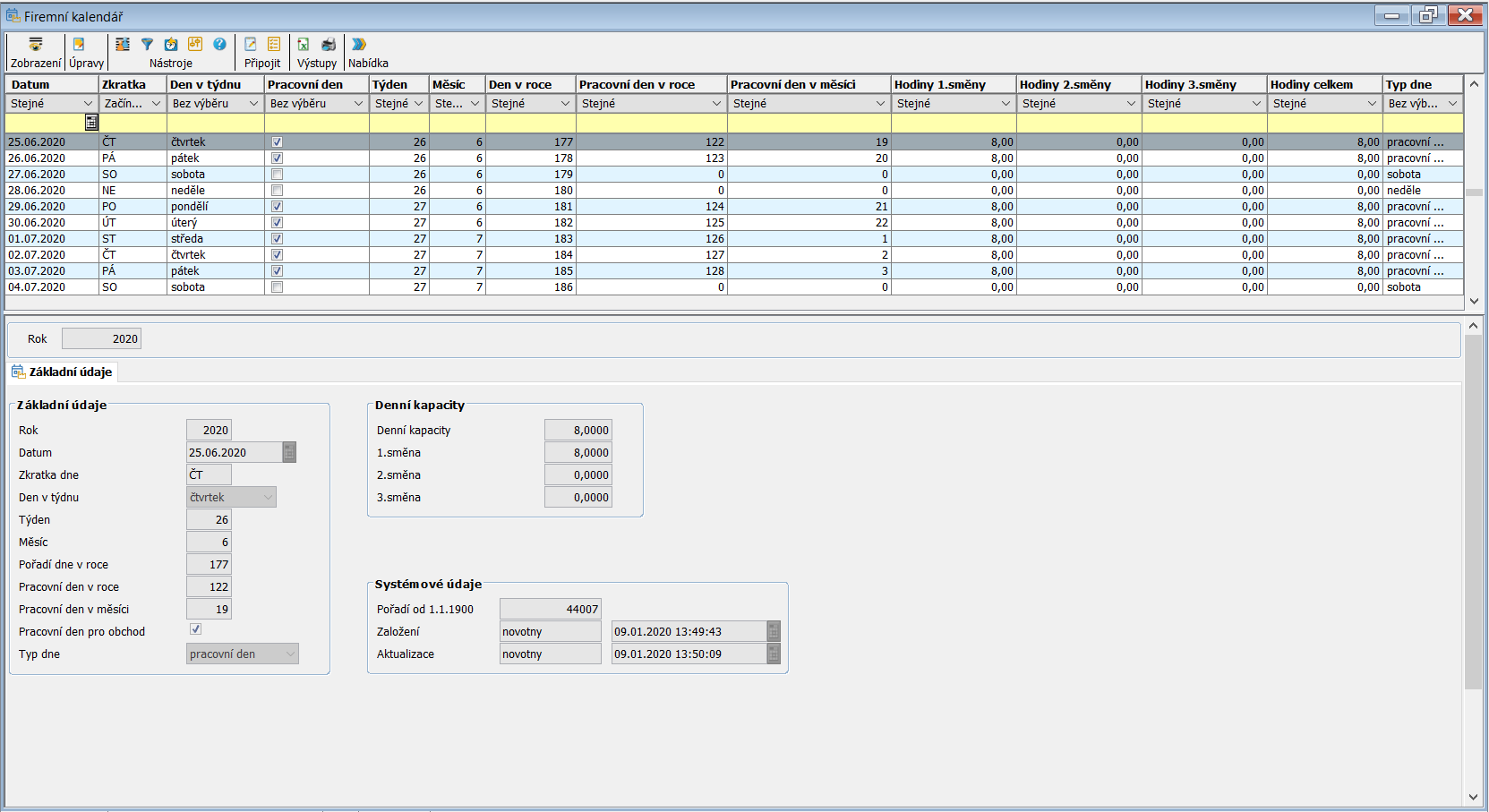 Program umožňuje zadání kapacit v hodinách pro jednotlivé směny podle celostátního kalendáře nebo podle podnikového kalendáře, který vychází z kalendáře celostátního a lze jej upravit podle potřeby dané firmy.