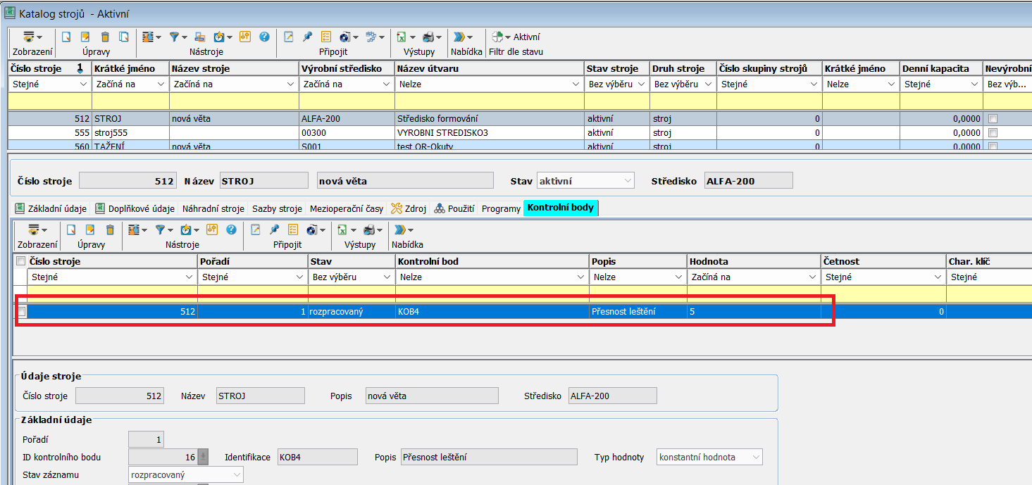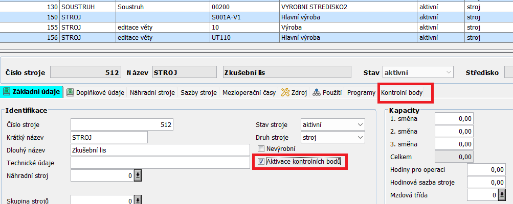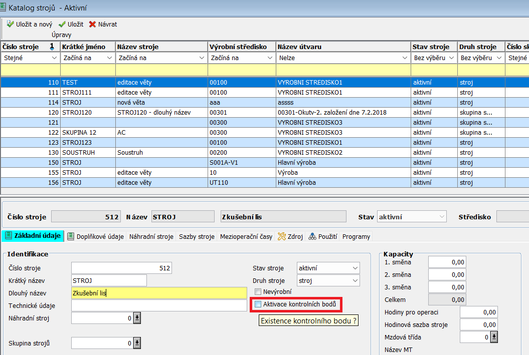 V menu Jádro logistiky (příp. TPV) /Základní data a číselníky/Stroje je pro přidělení kontrolního bodu k danému stroji nezbytné zaškrtnout atribut Aktivace kontrolních bodů. Ten se nachází v detailu záznamu v záložce Základní údaje. Atribut lze aktivovat jak při zakládání nového stroje, tak při editaci stroje již existujícího.