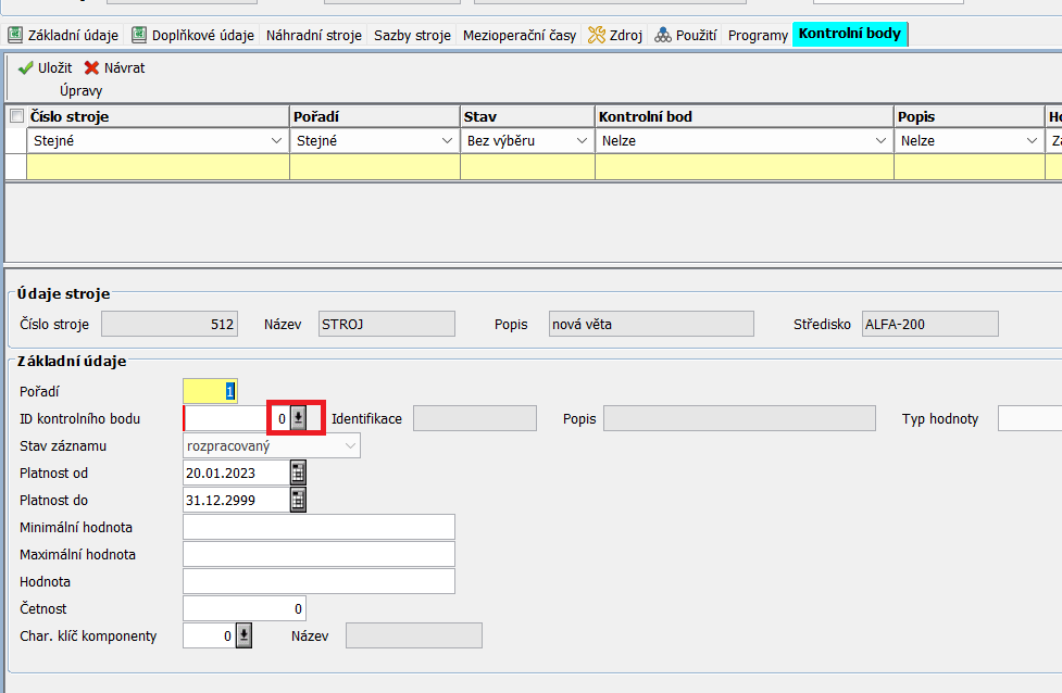 V záložce Kontrolní body vytvoříme nový bod pomocí tlačítka Nový záznam