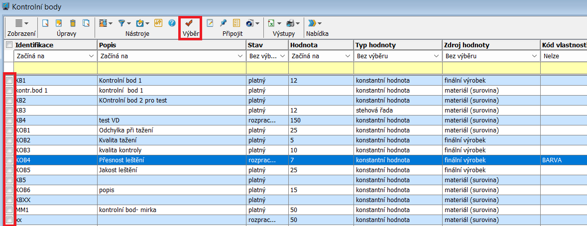 Z otevřeného seznamu vybereme požadovaný kontrolní bod. Pomocí zaškrtnutí políček checkboxu lze vybrat více bodů najednou. Volbu potvrdíme tlačítkem Výběr.