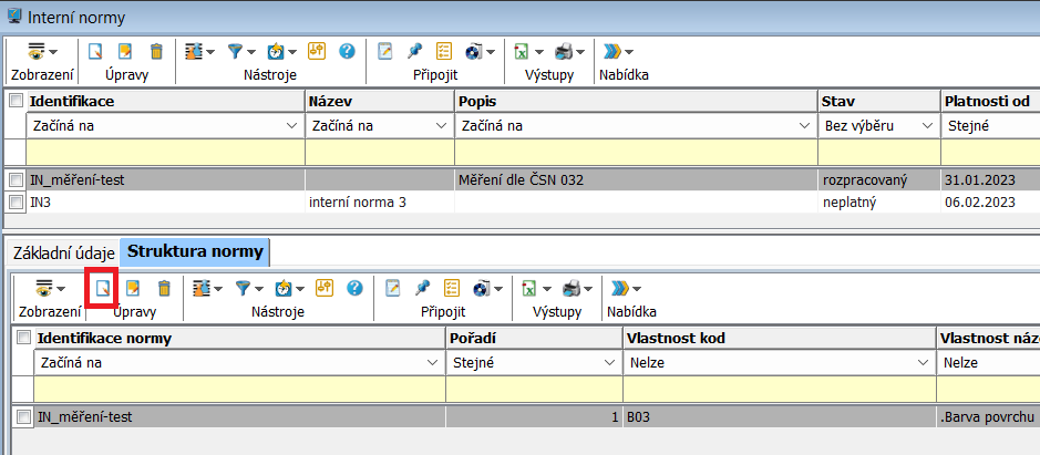 v panelu ikon nad záznamy vlastností, resp. v panelu ikon nad záznamy norem.