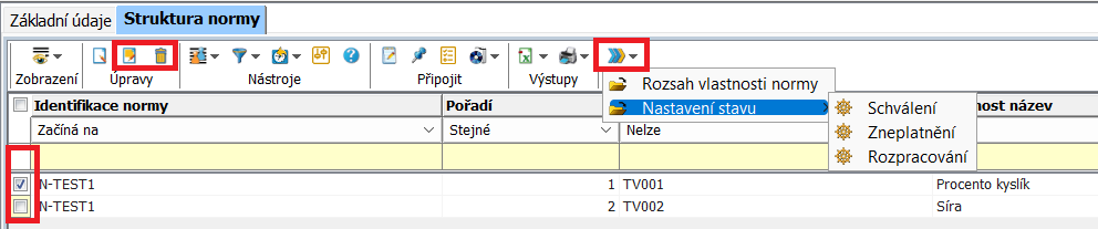 V případě, že chceme k normě přidat novou vlastnost, editovat ji, či smazat, musí být záznam ve stavu „Rozpracovaný“. Pomocí zaškrtnutého pole checkboxu (vlevo) vybereme jeden, nebo více záznamů. Nastavení stavu provádíme pomocí tlačítka Nabídka