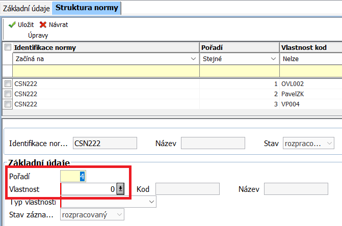 Pro vytvoření nové vlastnosti k vybrané normě použijeme tlačítko Nový záznam