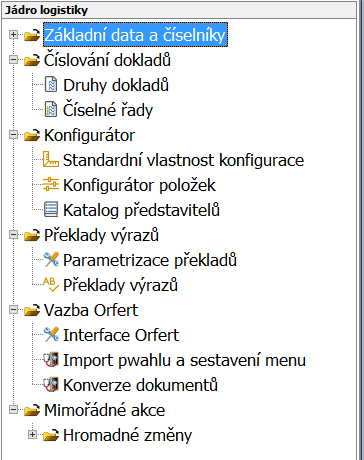 Dalšími kategoriemi je Číslování dokladů, Konfigurátor položek a doplňující programy pro správu celého systému v oblasti logistiky.