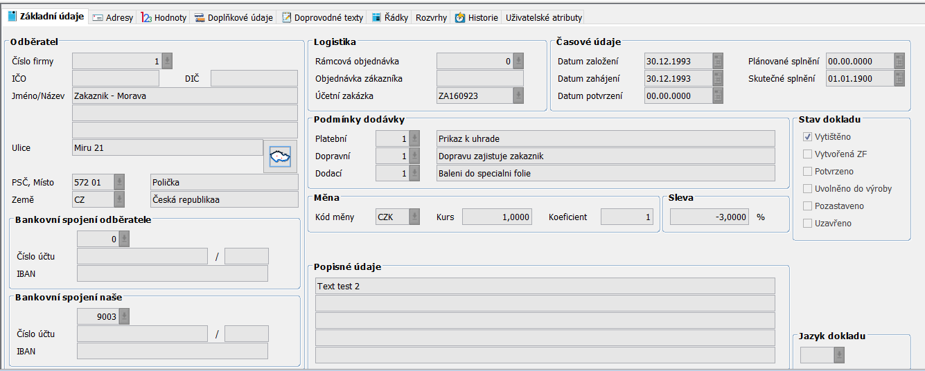 Každá zakázka (řádek tabulky) obsahuje základní údaje, které slouží ke specifikaci prodejní objednávky. Mezi tyto údaje patří odběratel, logistika, časové údaje o zakázce, bankovní spojení odběratele, podmínky dodávky, měna ve které se obchoduje, stav dokladu a další potřebné údaje.