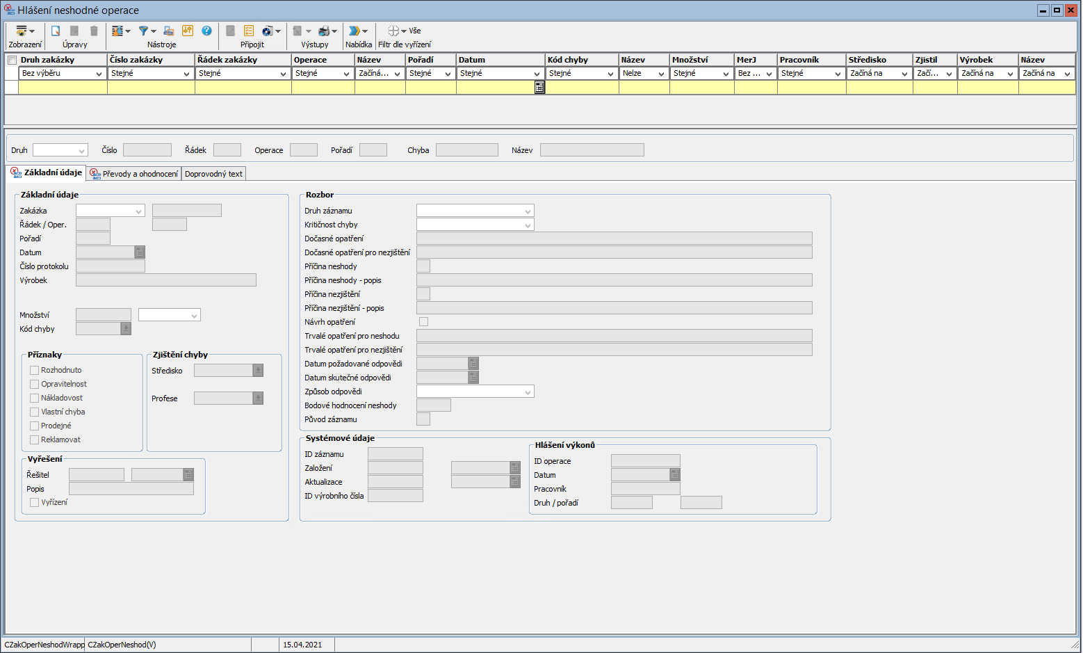 Hlášení neshodné práce operace výrobní zakázky
