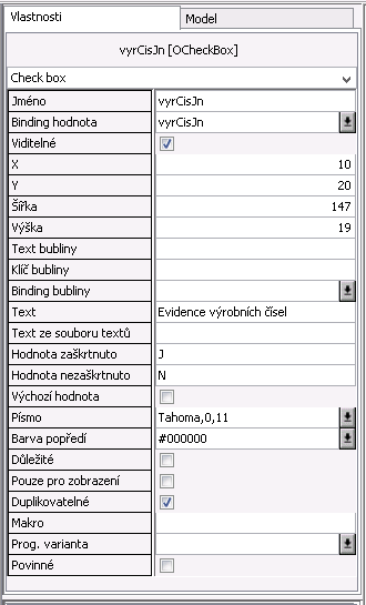 • Hodnota zaškrtnuto - Určuje hodnotu, která bude vyplněna do atributu nastaveného ve vlastnosti Binding hodnoty pokud je toto pole zaškrtnuto při ukládání záznamu.