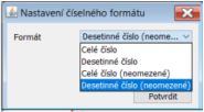 • Formát - Hodnota udává formát čísla, které je zadáváno/zobrazováno v poli. Proklikem je možné se dostat do funkce pro nastavení, kde se formát čísla vybere z rozbalovací nabídky a dopřesnění nastavení se provede zadáním dalších parametrů. Toto nastavení se poté uloží ve speciálním tvaru do textového řetězce uloženého jako hodnota vlastnosti Formát.