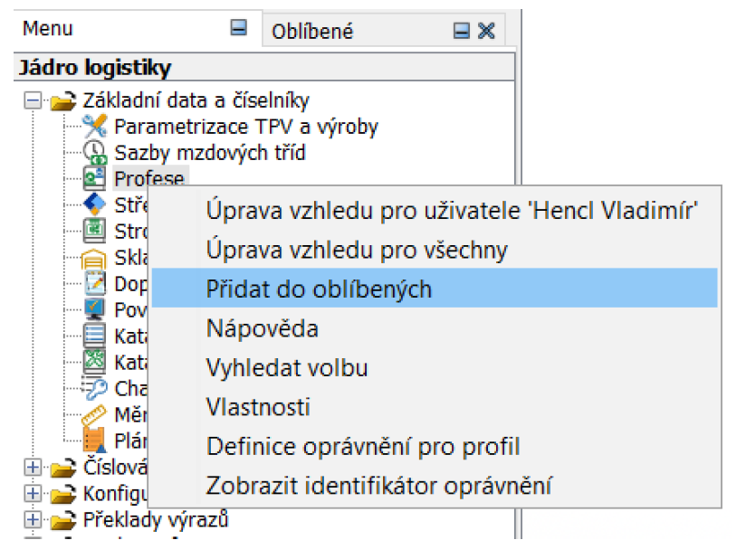 Horní záložka Oblíbené obsahuje seznam oblíbených úloh systému. Uživatel si může dle své potřeby přidávat libovolné úlohy z MENU a sestavit si svůj seznam programů, který mu ulehčí práci, místo hledání vybraných úloh mezi záložkami a složkami menu.