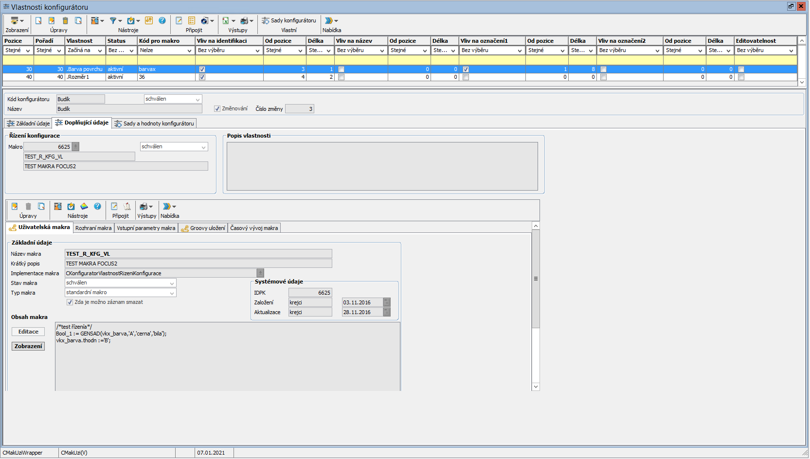 Test limitních hodnot – umožňuje nadefinovat limitní hodnoty, kterých může vlastnost nabývat. Při Doplnění charakteristik upozorňuje operátora, že zadávaná hodnota je mimo limit – měkká kontrola.