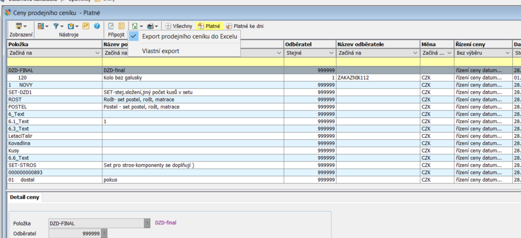 Umožňuje pohled na všechny řádky ceníku v souhrnném pohledu včetně přitažení hlavičkových údajů