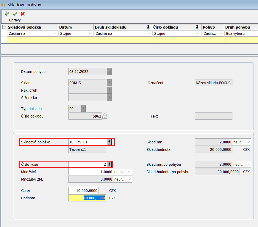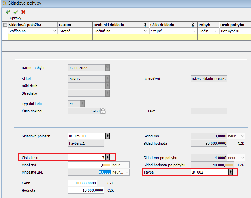 V rámci skladového příjmu je možné pro danou položku zadat tavbu i kusové číslo, kdy systém automaticky propojí zadané kusové číslo se zadanou tavbou a toto kusové číslo následně bude dostupné pro danou tavbu v záložce Kusová místa.