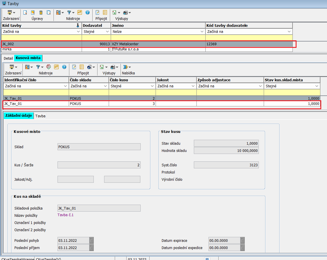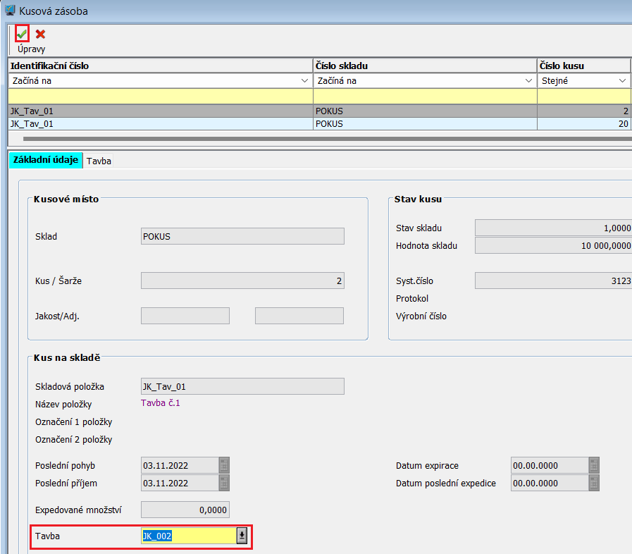 Nyní je v tabulce taveb pod záložkou Kusová místa přiřazena skladová položka s číslem kusu a je evidována pod konkrétní tavbou.
