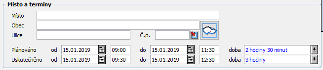 Na panelu Místo a termíny u položek Plánováno od-do a Uskutečněno od-do přibyly nové položky Plánovaná doba trvání (doba) a Skutečná doba trvání (doba). Doba trvání se vypočítává z datumů od-do, jsou-li oba vyplněny a datum do je větší než datum od. Dobu trvání lze také vybrat z nabídky nebo ručně zeditovat, po její změně se přepočítá datum a čas do a naopak, při změně datumu do se přepočítá doba trvání.