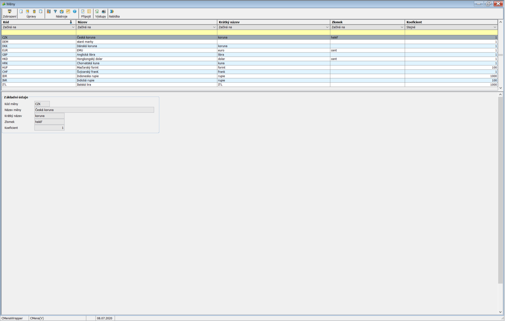 Tabulka měn se distribuuje jako předvyplněný databázový soubor. Obsahuje tedy veškeré světové měny a pro většinu případů ji není třeba doplňovat.