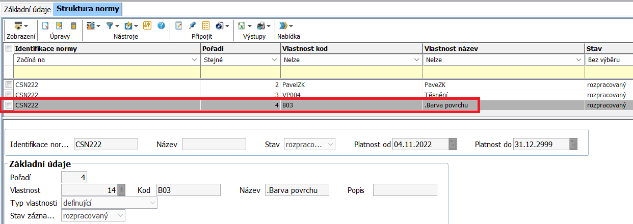 V případě, že chceme k normě přidat novou vlastnost, editovat ji, či smazat, musí být záznam ve stavu „Rozpracovaný“. Pomocí zaškrtnutého pole checkboxu (vlevo) vybereme jeden, nebo více záznamů. Nastavení stavu provádíme pomocí tlačítka Nabídka