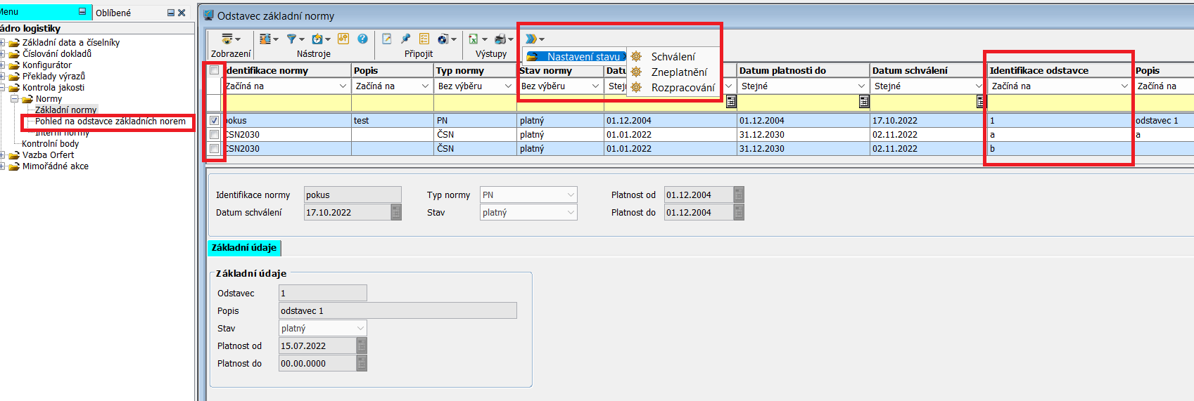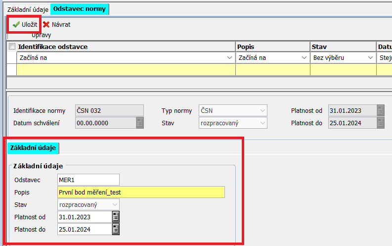 Nový odstavec lze založit a editovat v záložce Odstavec normy v menu Jádro logistiky / Kontrola jakosti / Normy /Základní normy.