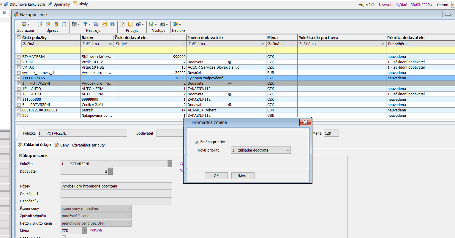 Umožňuje pro vybrané záznamy dodavatelské ceníky změnit prioritu .Priorita slouží při práci s nákupními požadavky pro automatizované daplnění dodavatele do nákupního požadavku. (použije se ceník dodavatele s nejnižší prioritou)