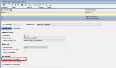 Definování rámcové objednávky se provádí v parametrech nákupních objednávek. Zde je důležité vyplnit checkbox „Příznak rámcové nákupní objednávky“ (pz_r_ak).