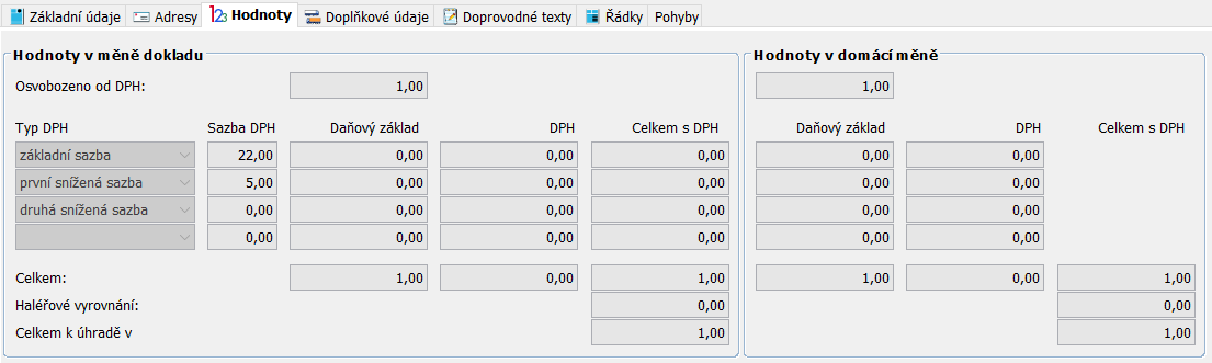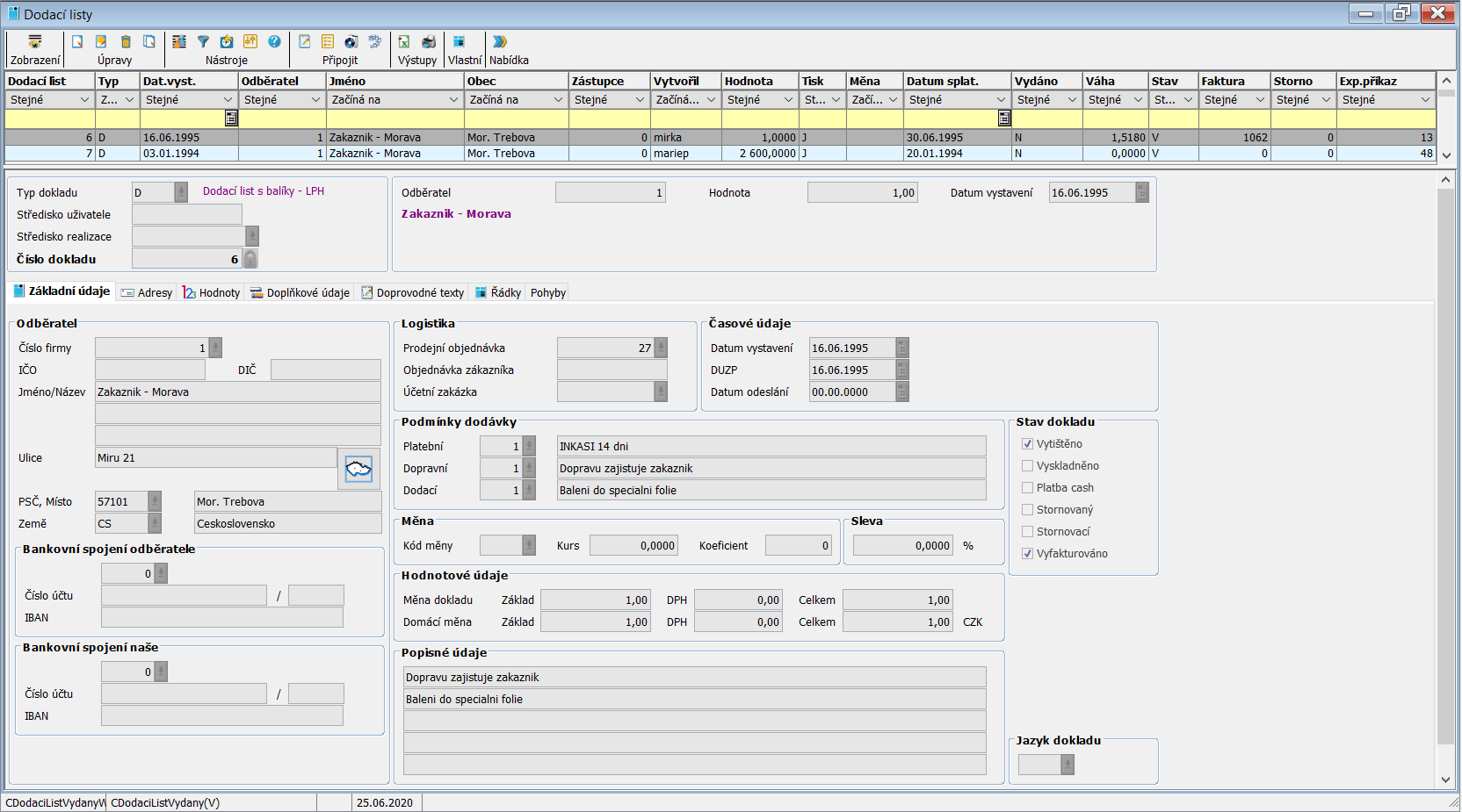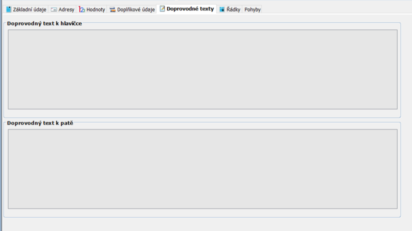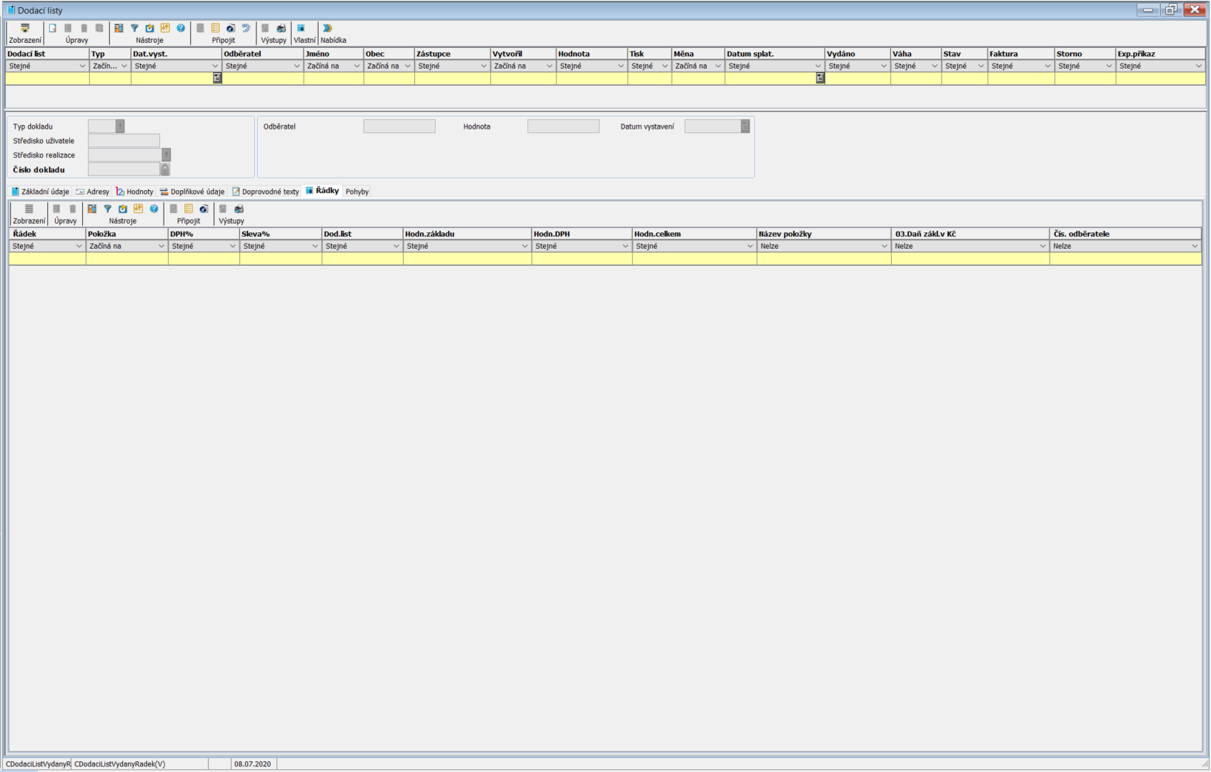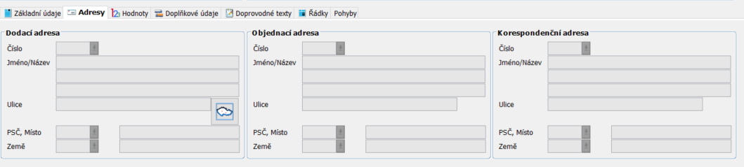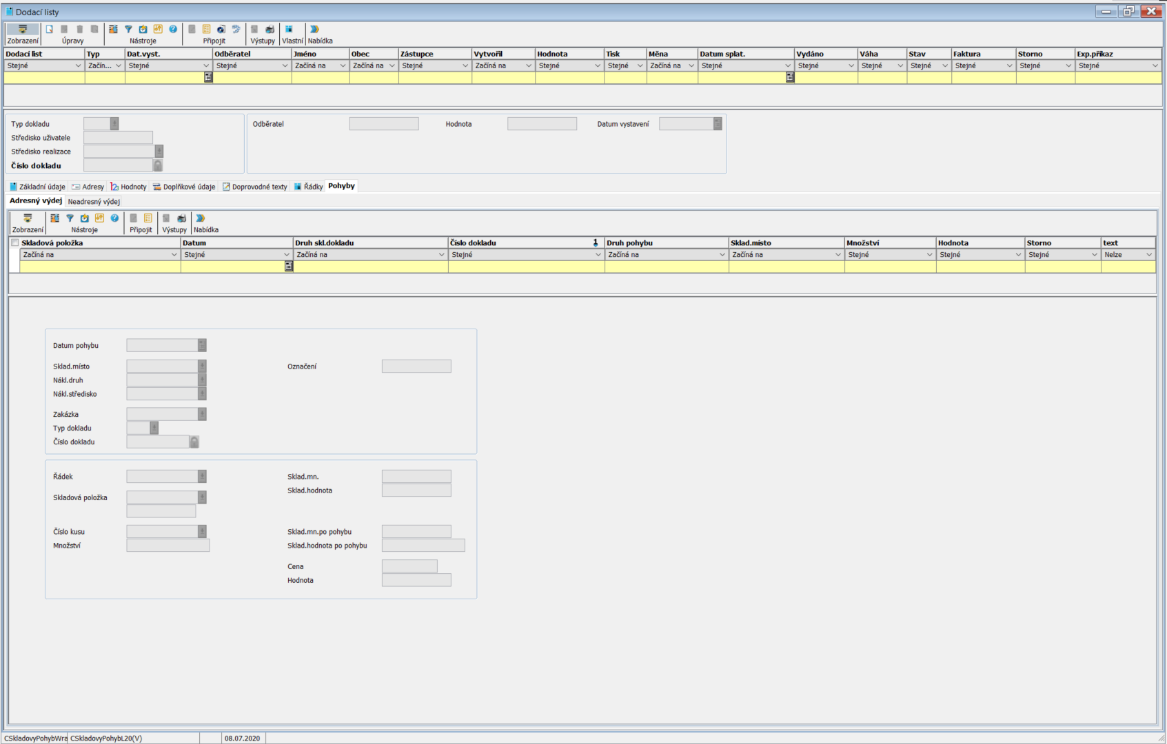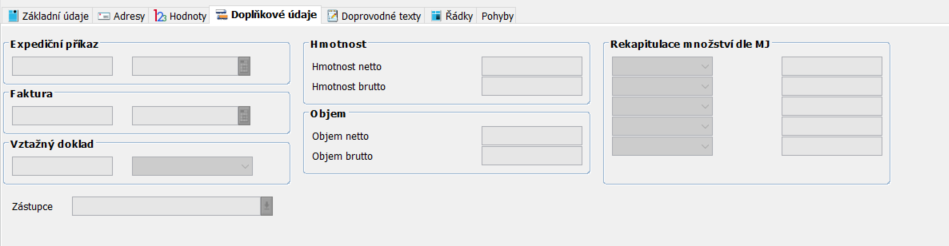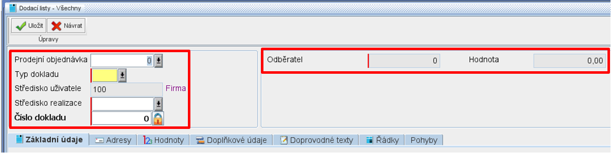 Po vyplnění hlavičky a uzamknutí lze zapisovat Základní údaje pro Dodací list. Pomocí jednotlivých záložek lze zapsat další informace Adresy, Hodnoty, Doplňkové údaje, Doprovodné texty, Řádky, Pohyby.
