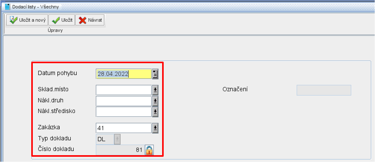 Jako první se musí zapsat hlavička dodacího listu. Vyplní se povinné pole Typ dokladu.