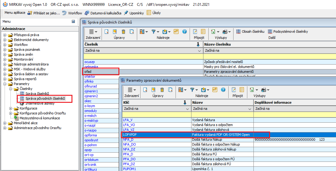 Neexistuje-li v číselníku „ofad“ hodnota „LOFVPDF“ je potřeba ji doplnit Administrace → Parametry → Číselníky → Správa původních číselníků → číselník „ofad“