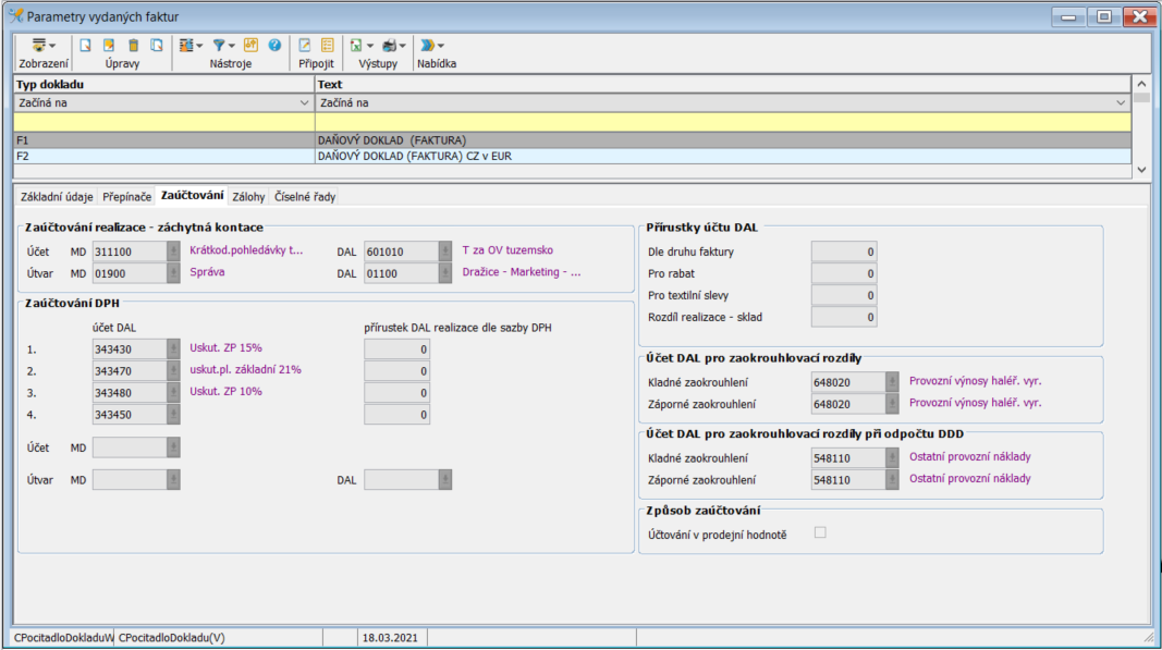 Obsahuje potřebné parametry pro správnou funkci zaúčtování včetně účtování dle platných sazeb DPH.