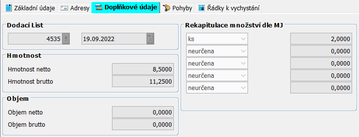 Doplňkové údaje informují o hmotnosti, objemu a množství položek vztahujících se k danému příkazu. Dále je zde systémem přiřazen vygenerovaný Dodací listy.