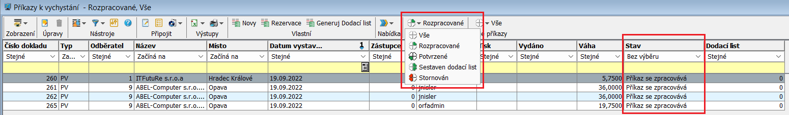 • Rozpracované - zobrazí se ty příkazy k vychystání, které jsou bez řádku nebo jsou ve stavu zpracování, tj. nejsou potvrzené