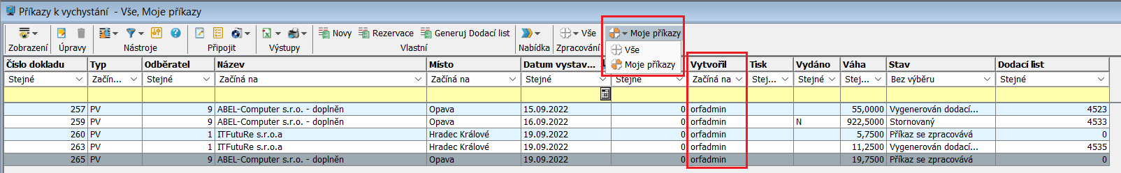 • Předdefinovaným čtyřlístkovým filtrem zobrazit příkazy dle stavu zpracování a zároveň příkazy mnou založené nebo všechny bez upřesnění.