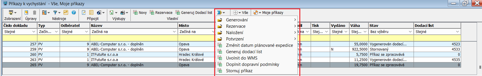 • Vše - zobrazí se všechny příkazy k vychystání
