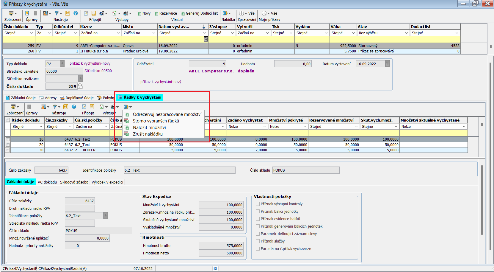 Program příkazů k vychystání v sobě obsahuje ještě další funkce, které se spouští přímo nad řádky příkazu k vychystání. Funkce jsou pod tlačítkem Nabídka