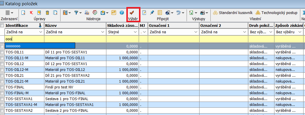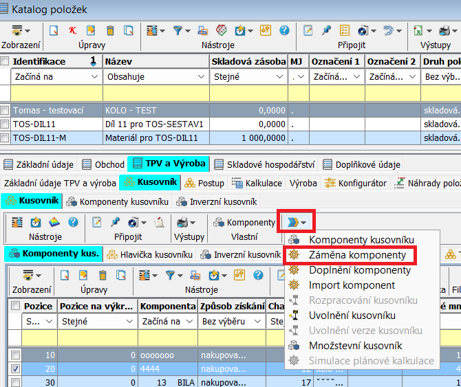 Funkci nalezneme v menu Jádro logistiky (příp. TPV) / Katalog položek / záložky TPV a Výroba / Kusovník / Komponenty kusovníku