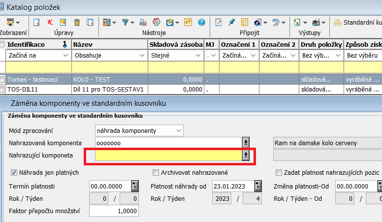 Určuje, zda-li se má náhrada komponent provést pouze pro platné kusovníkové pozice („A“), nebo u všech pozic. Zaškrtneme-li políčko atributu, že se záměna vztahuje pouze na platné, musíme zadat i Termín platnosti.