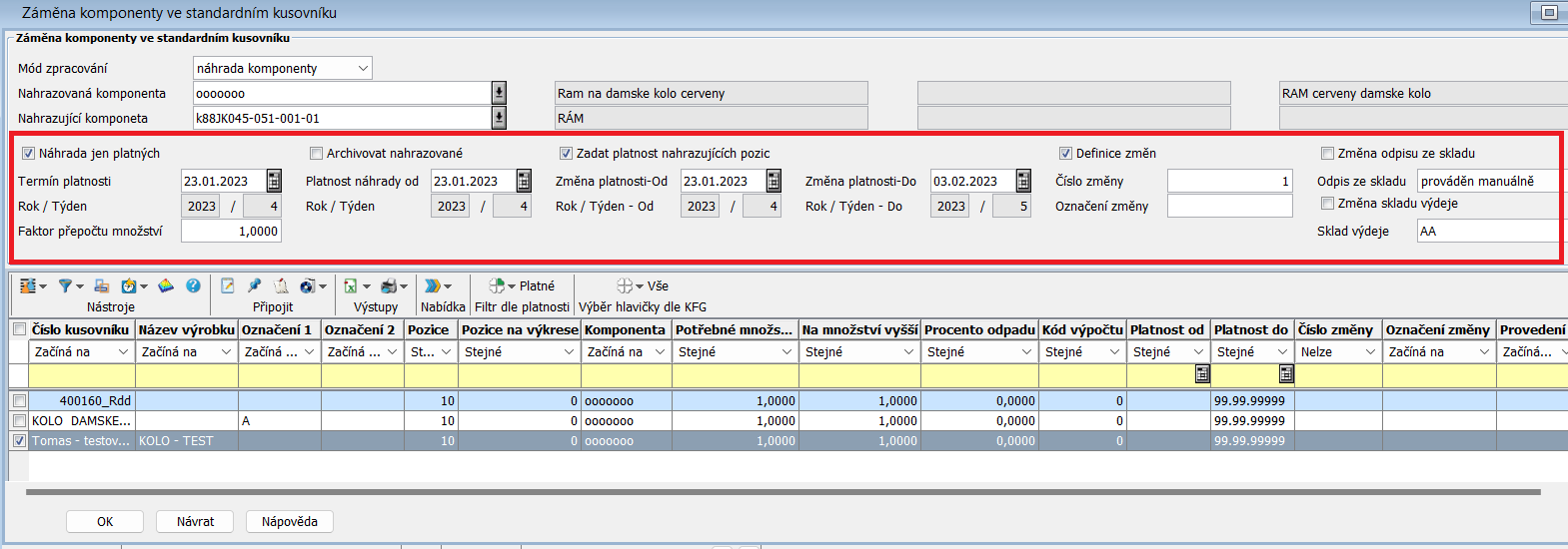 Zaškrtneme políčko pro atribut, pokud se má upravit platnost kusovníkových pozic, u kterých proběhne náhrada. V případě, že ano, opět musíme vyplnit pole Změna platnosti-Od a Změna platnosti-Do.