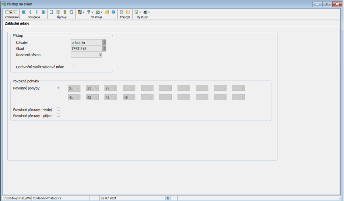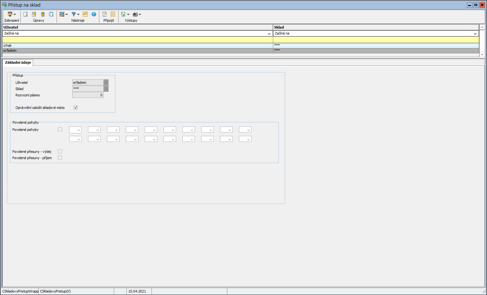 Každý uživatel může vytvářet nové skladové pohyby pouze pokud má oprávnění pro příslušný sklad a skladový pohyb. Právě tato oprávnění se nastavují v této úloze.