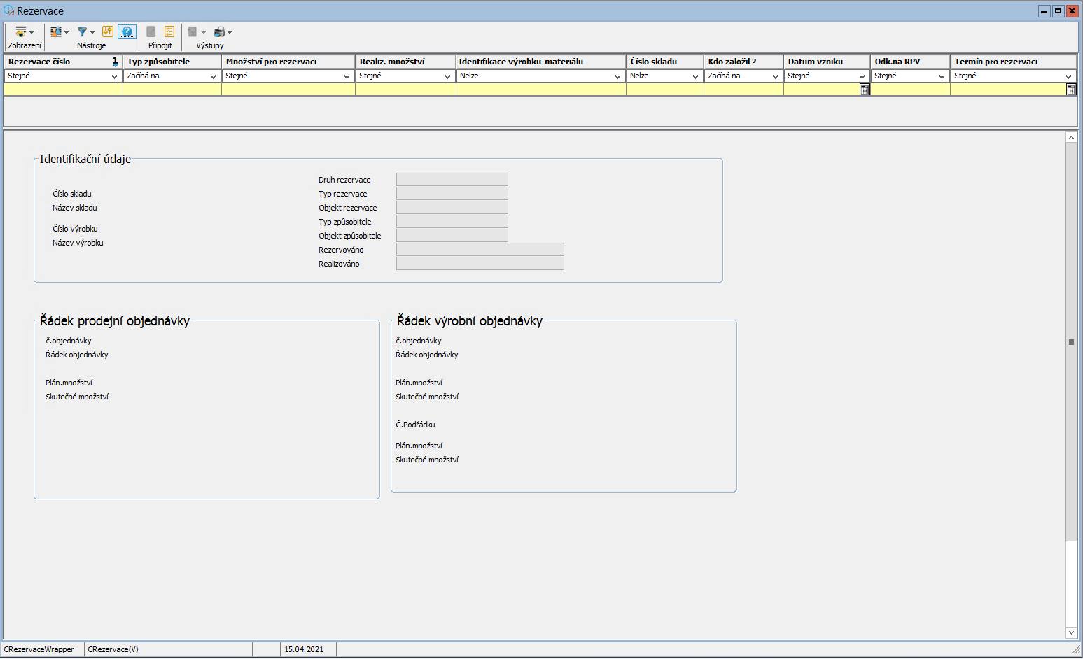 Skladová rezervace využívá úlohu Správa rezervací pro evidenci všech rezervací materiálu na skladě.
