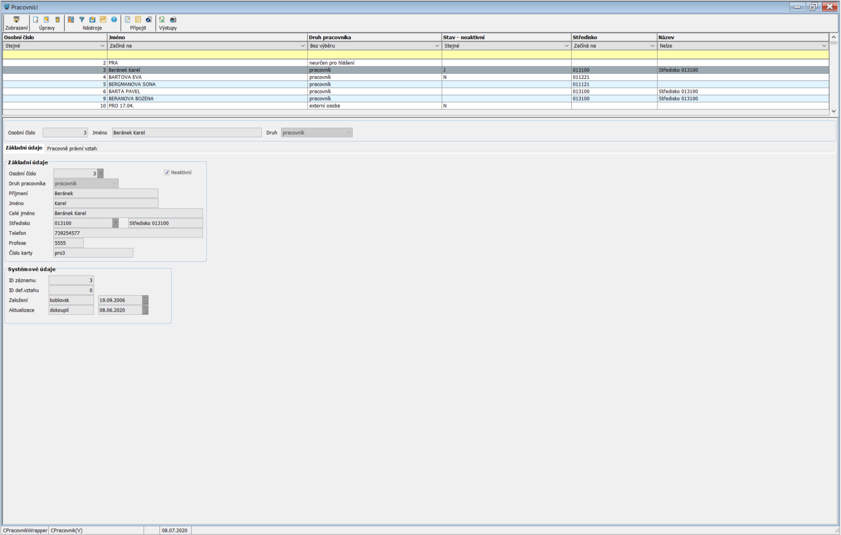 Program slouží pro správu pracovníků, poskytuje informace o jednotlivých pracovnících (základní údaje) a lze jim dále přidělit pracovně právní vztahy.