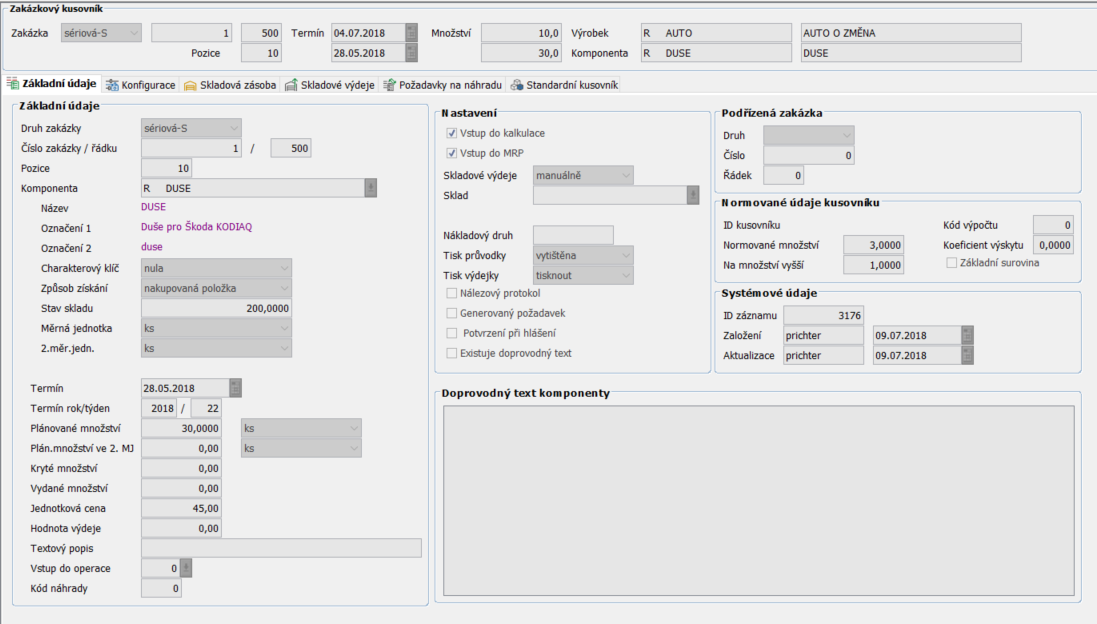 Pro každou zakázku lze zobrazit skladovou zásobu i veškeré výdeje ze skladu pro danou zakázku. Dále je možnost zobrazit standardní kusovník, který obsahuje veškeré komponenty vstupující do dané zakázky.