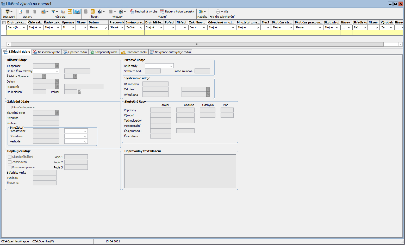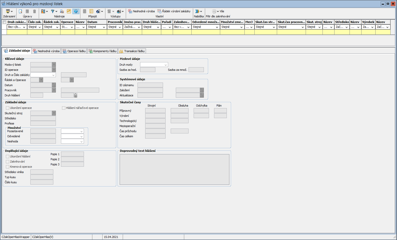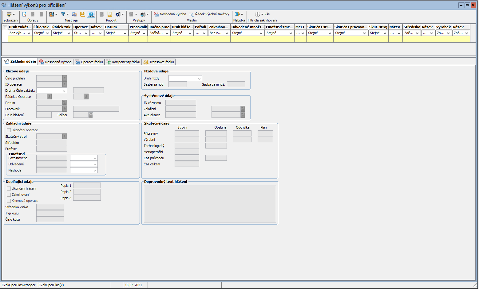 Úloha hlášení výkonů slouží k odvádění operací ve výrobě. Nejčastěji je provozována na kiosku ve výrobě, kde si chodí pracovníci odhlašovat své výkony.