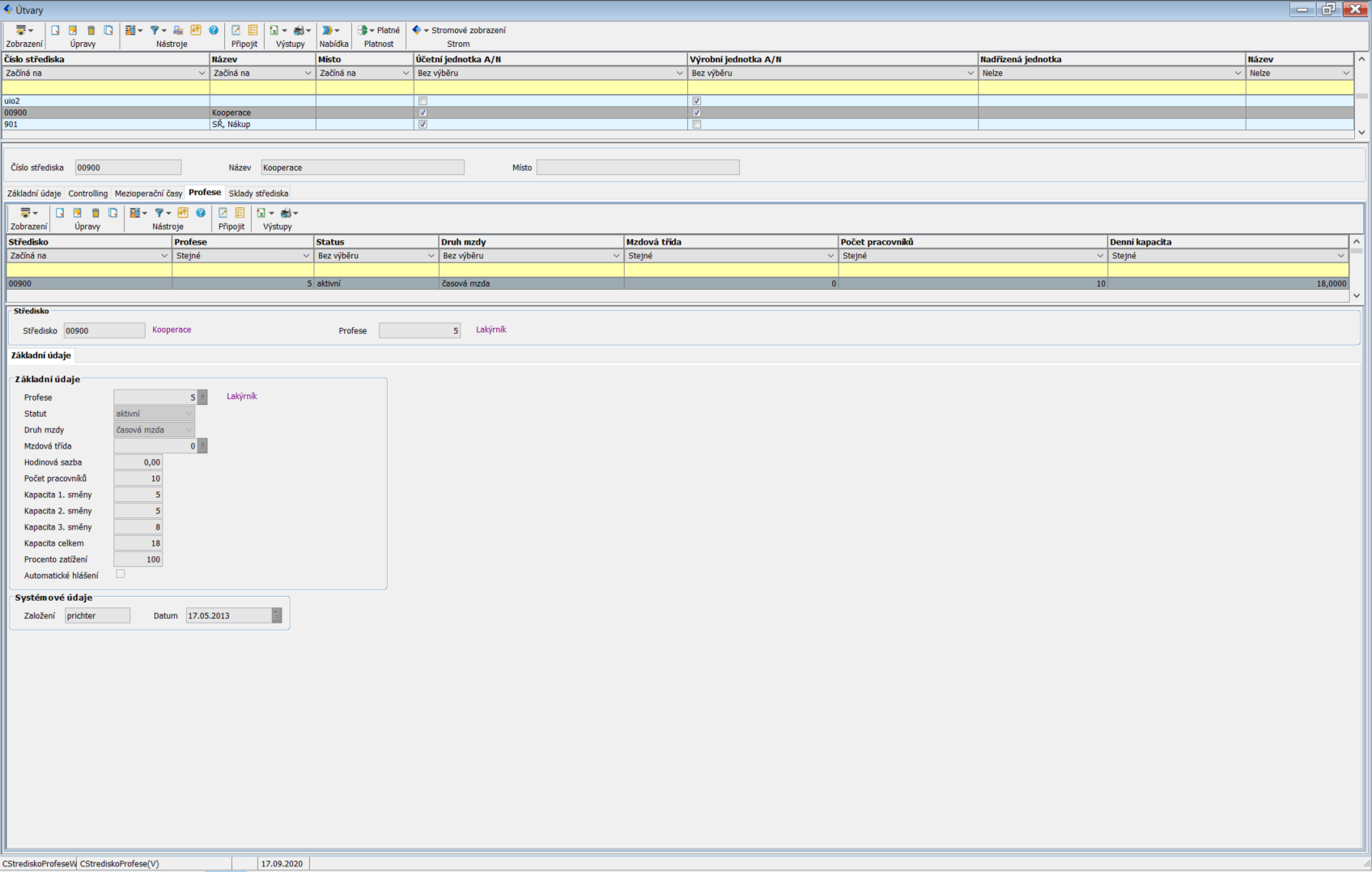Každý Útvar má evidenci profesí, které toto středisko využívají. Zde jsou uchovány informace o mzdě, kapacitě a vytížení střediska.
