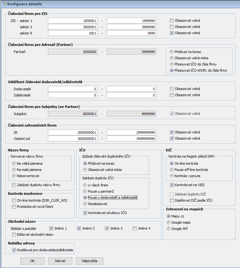 Dodavatelé - rozsah čísel firem pro dodavatele, tj. pro firmy, které mají v klasifikaci zaškrtnut příznak Dodavatel. Rozsah má přednost před intervaly pro Adresář a Subjekty. Pro nevyplněný interval, tj. od 0 do 0, se použije rozsah pro Adresář resp. pro Subjekty. Lze nastavit možnost „Obsazovat volná“, potom se čísla přidělují tak, že se využívají i volné mezery v řadě existujících čísel firmy. Jinak se přidělí nejvyšší existující číslo firmy plus jedna. Toto nastavení má smysl vyplnit pouze tehdy, je-li požadováno odlišné číslování dodavatelů a odběratelů.