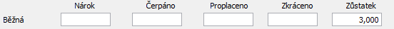 V položce „čerpáno“ je počet dnů dovolené za aktuální rok, které již byly čerpány od počátku roku. Čerpaná dovolená se zadává každý měsíc do měsíčních dat k příslušnému zaměstnanci. Tato položka se prakticky doplňuje automaticky při měsíčním promítání obratů. V položce „proplaceno“ je počet dnů dovolené, které byly v aktuálním roce proplaceny. Jestliže, je počet záporný, dovolená byla přečerpána a zaměstnanci byla za příslušný počet dnů stržena náhrada ze mzdy. Hodnota se opět doplňuje automaticky při měsíčním promítání obratů. V položce „zkráceno“ je počet dnů, o které byl zákonný nárok zaměstnance zkrácen z důvodů, které vznikly v příslušném kalendářním roce. V položce „zůstatek“ je počet dnů dovolené za běžný rok, které ještě zbývá vybrat. Jde o „průměrně“ dlouhé dny ve vztahu k týdennímu úvazku. Při nástupu lze hodnotu pořídit v odpovídající výši, nebo doplnit stiskem tlačítka Dopočet, program spočítá na základě základního nároku a údajů v konfiguraci. Vypočte se poměrná část dovolené (za předpokladu že zaměstnanec odpracuje 60 dnů v roce) nebo dovolená za odpracované dny.