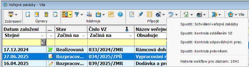 Změna stavu umožní vrátit VZ na předchozí stav, nebo posubout do následujícího stavu - viz posloupnost nabízená v menu filtry.