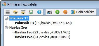 Pro uživatele se zobrazuje příjmení a jméno uživatele (osoby) , přihlašovací jméno (login) uživatele , název stroje , ze kterého je přihlášen, a ID přihlášení . Údaje login, název stroje a ID přihlášení se zobrazují po rozkliknutí uzlu se jménem uživatele. Je-li uživatel přihlášen vícekrát, bude v uzlu více položek s různým ID přihlášení.