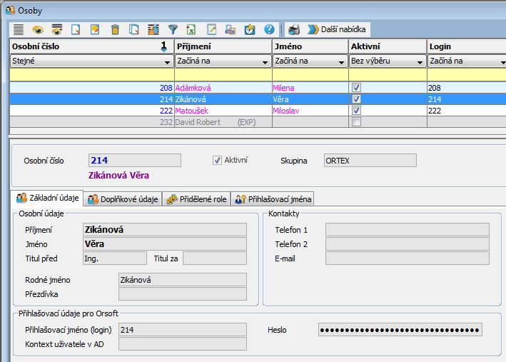 Přihlašovací údaje - zde jsou uvedeny přihlašovací údaje pro původní samostatně spouštěný cobolský Orsoft. Jsou pouze pro prohlížení. Změnit se dají editací přihlašovacích údajů v uživatelích, přičemž údaje pořízené v uživatelích se do osob propisují v tom případě, že osoba má jediné přihlašovací jméno do Orsoftu (tj. jediného (jednoznačného) uživatele).