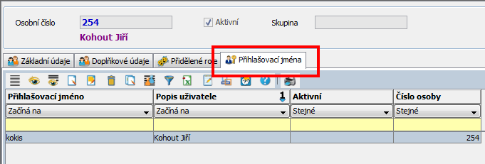 Na této záložce lze spravovat uživatele přidělené osobám. Aby se mohla osoba přihlašovat do systému, musí mít přiděleného alespoň jednoho uživatele (přihlašovací jméno).