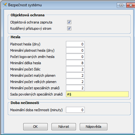 Zde se nastavují parametry pro přístupová hesla do Orsoftu
