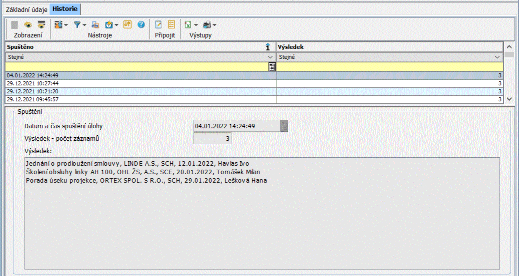 Výsledek - práce s výsledkem úlohy. Spuštění úlohy může vytvářet tzv. výsledek, což bývá často např. seznam záznamů (např. smlouvy s prošlým termínem platnosti apod.) nalezených při kontrole termínů. Obsah výsledku vytváří buď program spojený s úlohou nebo jej lze pro některé úlohy definovat v parametrech úlohy.