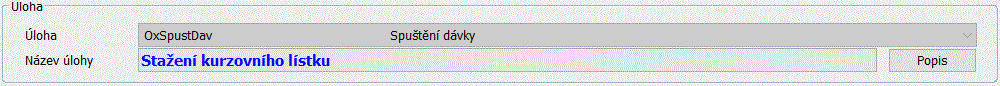 Název úlohy - zde se vyplní název konkrétního použití úlohy, který si volí uživatel. Názvem lze rozlišit konkrétní určení plánované úlohy, kdy jedna úloha (z O0TASK) může v závislosti na parametrech provádět různé akce. Názvy úloh by měly být unikátní. Vzorové úlohy (viz detailněji níže) mají Název úlohy začínající na „=VZOR=“ nebo „=VZOR-ORCZ=“.